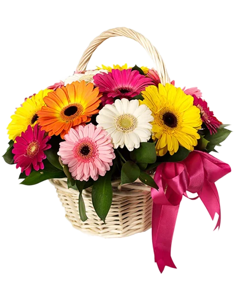 Gerbere arancio, rosa, fuxia, bianche e gialle lavorate in un cesto di vimini con manico. Fiocco decorativo.