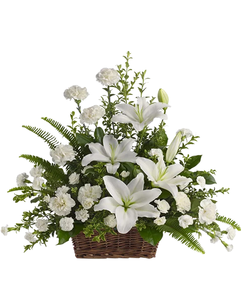 con Lilium bianchi, garofani bianchi e verde di complemento in cesto.
