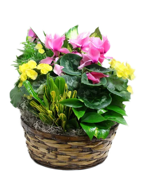 Un cestino armonioso e vivace, che dona allegria e colore a chi lo riceve. Una composizione mista di piante, verdi e fiorite. Speciale in occasione di un Compleanno o per un giorno felice.
